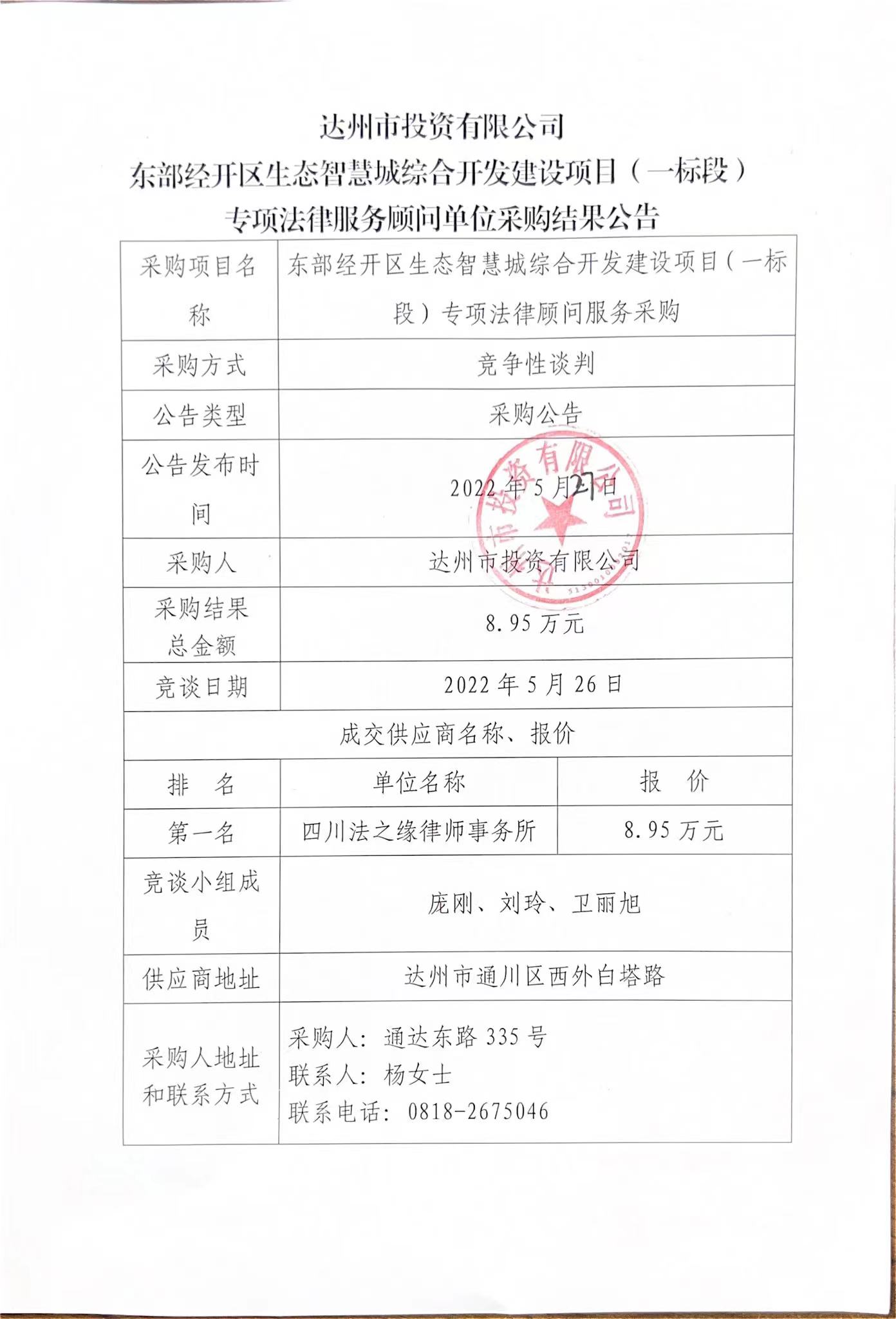 東部經(jīng)開區(qū)生態(tài)智慧城綜合開發(fā)建設項目(一標段)專項法律服務顧問單位采購結果公告