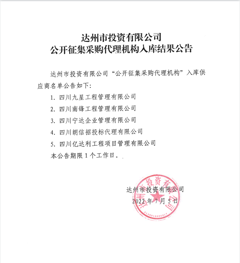 公開征集采購代理機(jī)構(gòu)入庫結(jié)果公告